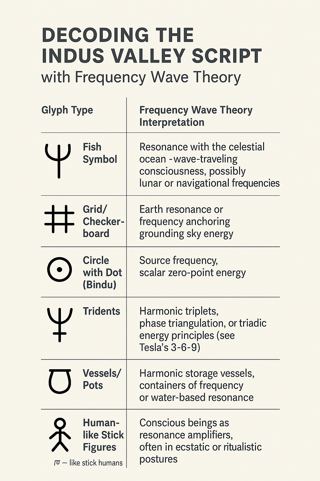 Decoding the Indus Valley Script through Frequency Wave Theory (FWT) offers a revolutionary approach that bypasses traditional linguistic decryption and instead treats the script as a vibrational and symbolic frequency code—a waveform-based language encoded in geometric glyphs, cosmic resonance, and cultural harmonics.