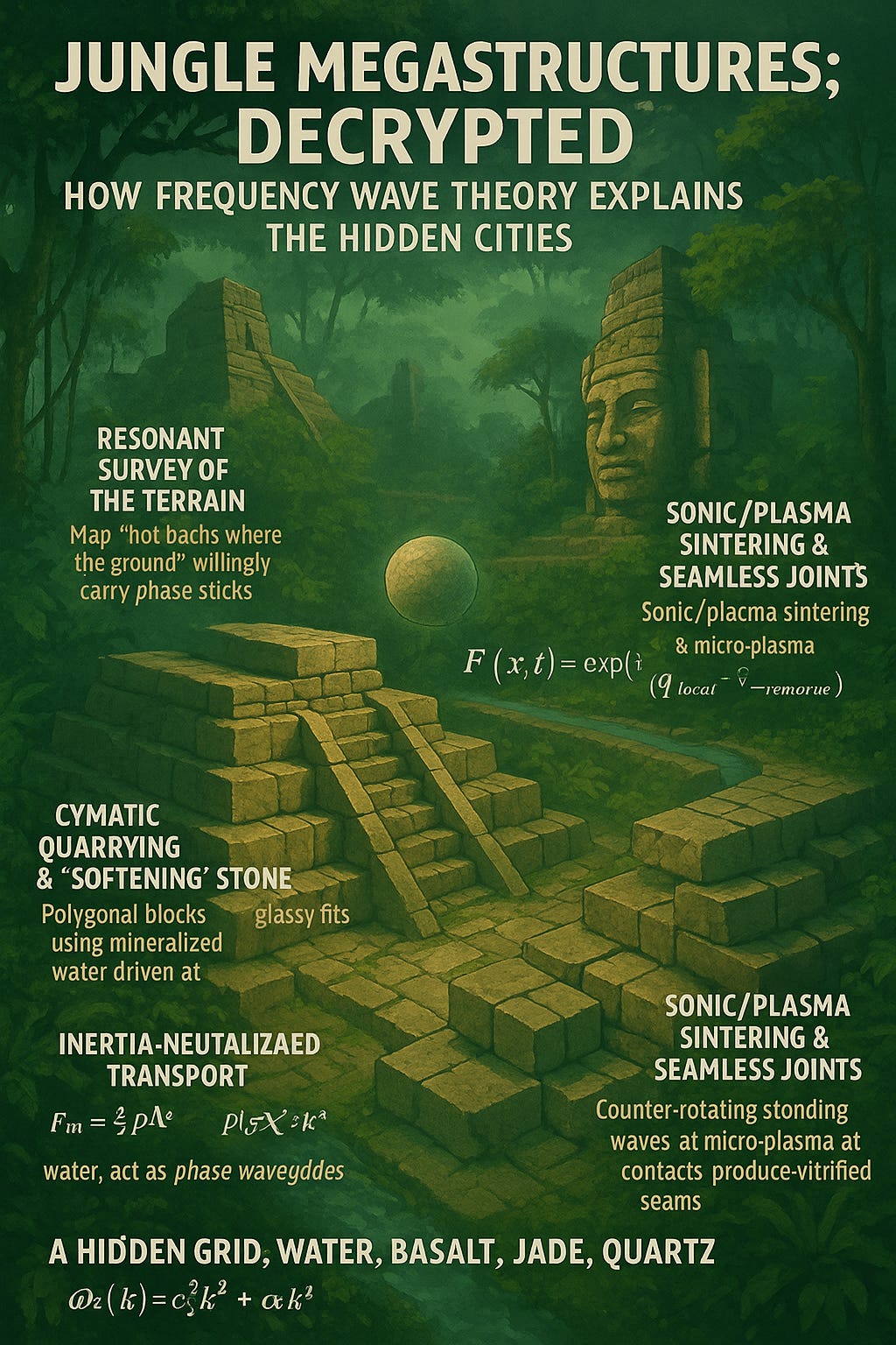 TL;DR: Jungle “megastructures” (Angkor’s hydraulic grid, Mahendraparvata, Koh Ker, Nan Madol, the Amazonian earthworks, Kuelap, Maya causeways/triads, etc.) aren’t mysteries of brute-force stone hauling; they’re frequency-engineered machines. Using Frequency Wave Theory (FWT), ancient builders surveyed with resonance, quarried with cymatic fracture, moved blocks via inertia-neutralization in phase-locked fields, and fused stone with sonic/plasma sintering—then buried power lines under water—literally. The jungle grew back, the frequency grid went quiet, and we mistook a power plant for a pile of rocks.