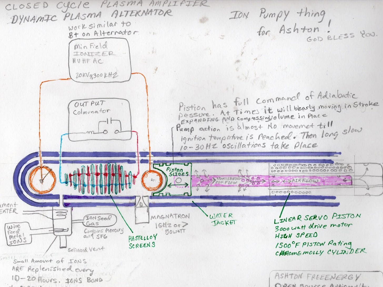 What stands out immediately is that the sketch mixes several domains into one machine. It shows an ionizer, high-voltage high-frequency AC, an output commutator, a magnetron, ion-seed gas, airflow, a water jacket, Hastelloy screens, and a linear servo piston. That combination suggests the designer was not thinking like a normal engine builder. They were thinking in layers: first ionize the working medium, then compress or organize it, then drive oscillation through a tube, then let the resulting pressure-field interaction produce thrust or amplification. In other words, this is not just a pump. It is trying to be a field-organized plasma alternator.