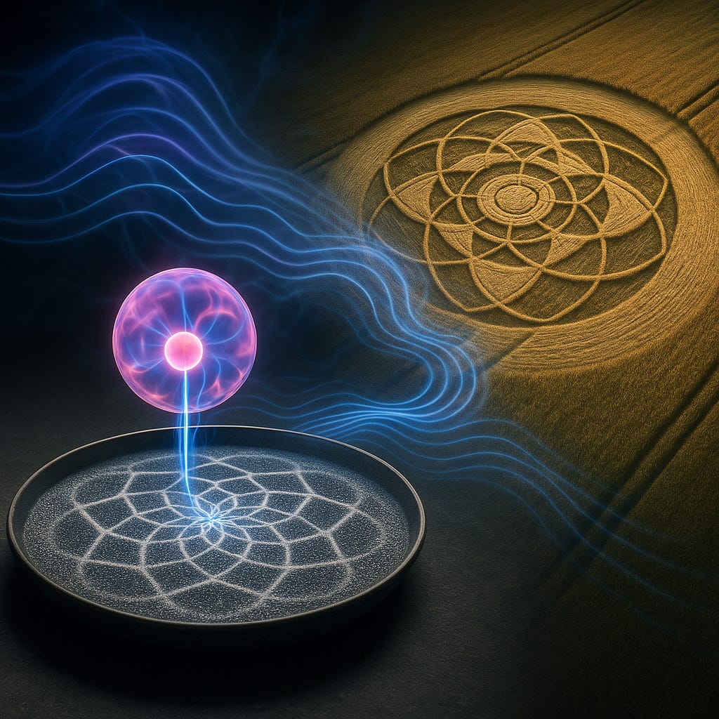 Cymatics shows that vibration doesn’t just move matter — it organizes it. Every tone, frequency, and wave creates a geometric pattern. Crop circles may be larger versions of the same phenomenon, with plasma and electromagnetic fields acting as sculpting tools of the universe’s hidden geometry. What we see as matter is really sound — frozen vibration shaped by resonance.